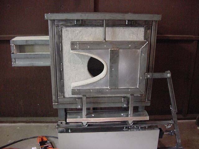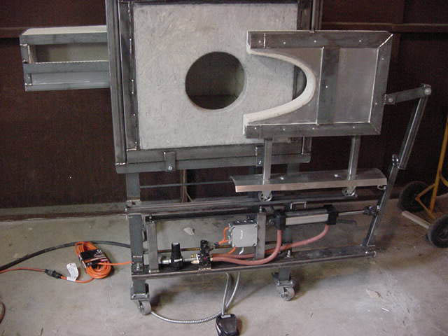 Tom Ash was kind enough to supply these photos of his energy saving, parabolic opening (the opening in the door is a parabola - the door itself slides straight to the right), pneumatic gloryhole door. The first three photos are in sequence with the door closed, about 1/4 open, and about 2/3 open. The last two photos give a better view of the opening mechanism and how he uses pivots and leverage to utilize a short travel air cylinder to open the door, which saves money on parts. Here is the description he sent along with the photos: